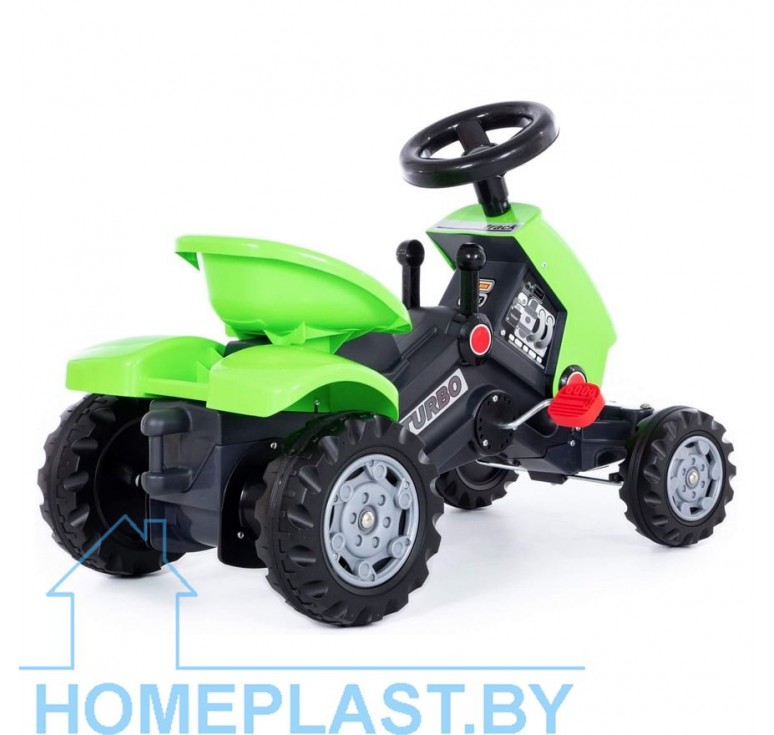 Замечательный подарок для ребёнка от 3-х лет. Ребёнку стоит лишь начать крутить педали - мини трактор «Turbo» начнёт своё движение. При помощи руля ребёнок может выбрать направление своего движения, а рычаги на панели добавляют трактору-каталке ещё больше реалистичности. Рычаги носят сугубо декоративный характер, имитируя коробку передач. Механизм приводится в движение при помощи цепи. Высота посадки - 300 мм. Езда на каталке с педалями, как и езда на велосипеде, развивает общую координацию движений, способствует физическому развитию.