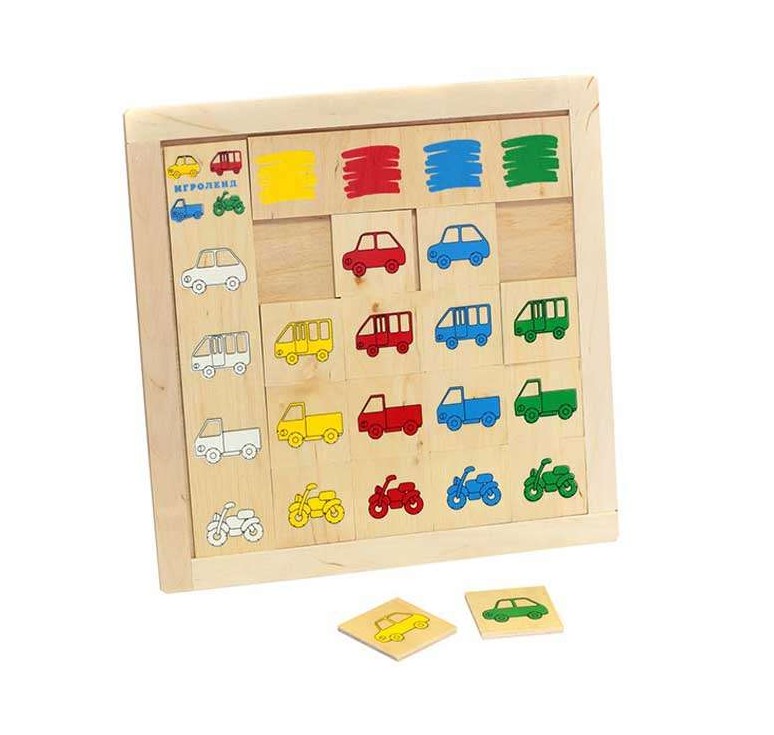 Игровой набор состоит из деревянного планшета 27х27 см и 16 карточек с изображениями различных моделей машнок размером 5х5 см. На деревянное панно укладывается полоска с машинами разных моделей (машины не раскрашены), в верхней части необходимо установить полоску с красками. Малышу необходимо разместить карточки с цветными машинками в нужном порядке, ориентируясь на планки, уложенные вдоль панно, пытаясь классифицировать предметы, выделяя заданные признаки.