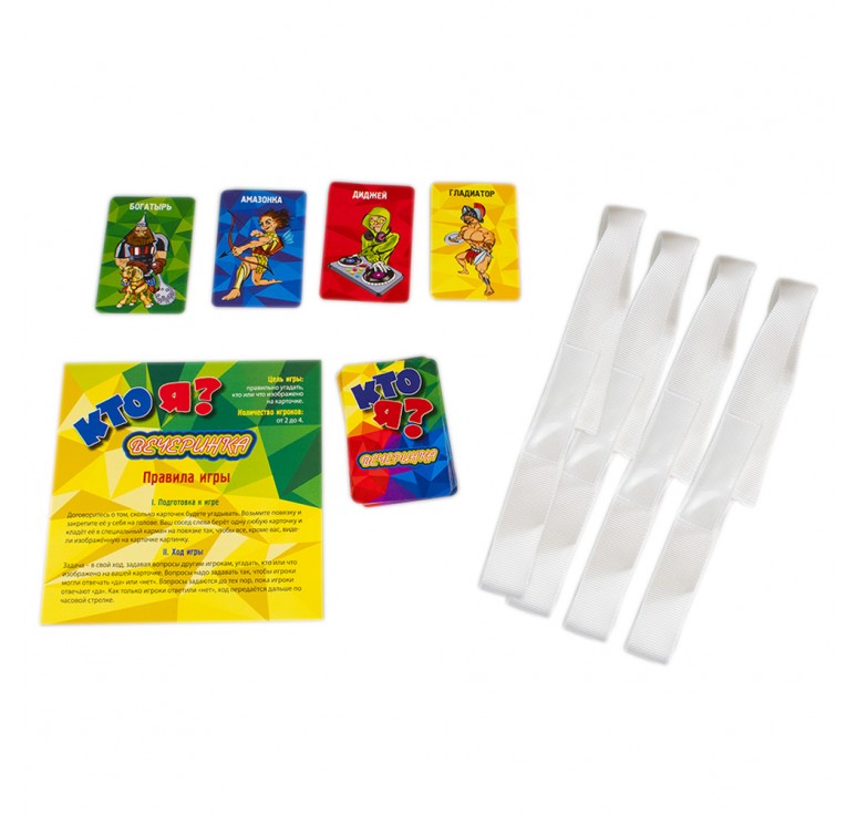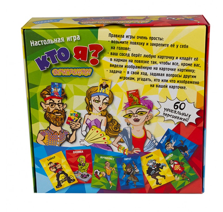 Размеры, см: 17,6*5,5*17,6Вес, кг: 0,2«Кто я? Вечеринка» — это игра для любой компании. Она идеально подходит для детей от 6 лет и рассчитан на 2-4 игрока. Цель игры - правильно угадать изображённую на карточке картинку. Настольная игра «Кто я? Вечеринка» развивает логическое мышление и навыки общения. Комплектация: трикотажная повязка с карманом: 4 шт., игровые карточки: 60 шт., правила игры