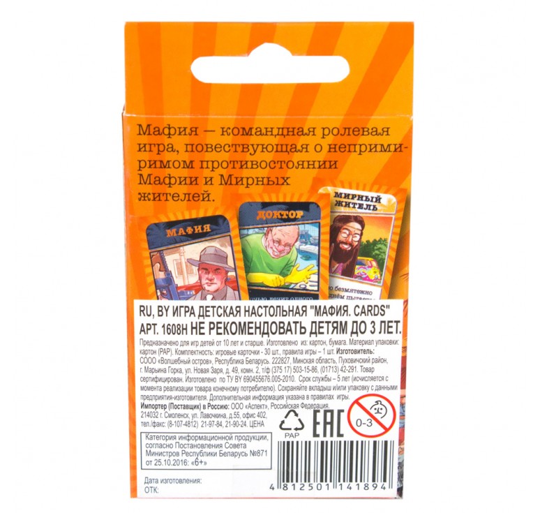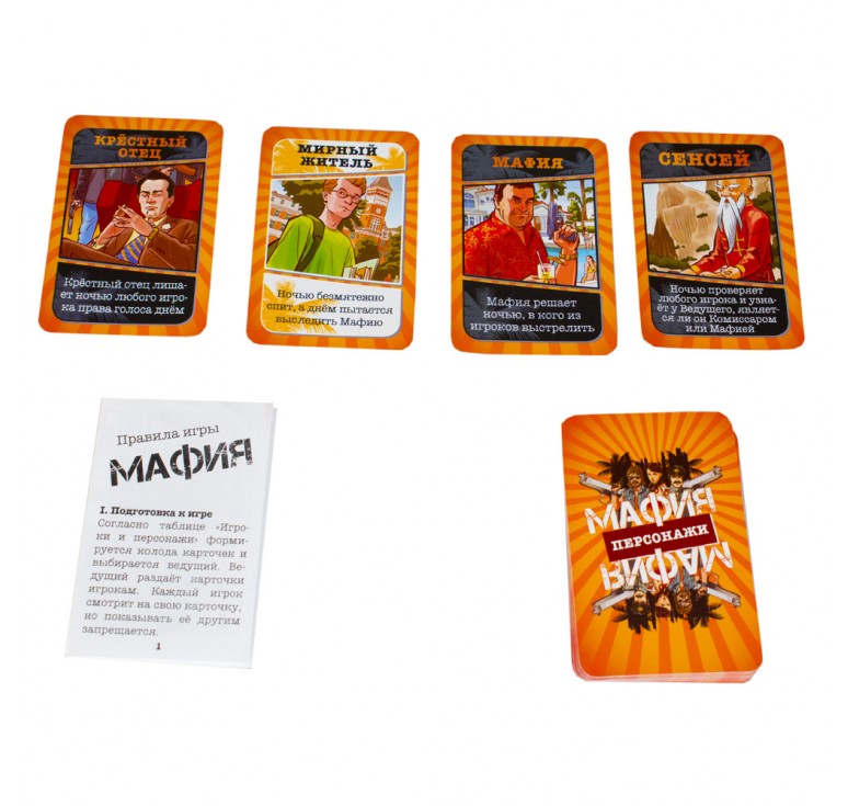 Размеры, см: 10,5*1,2*5,9Вес, кг: 0,048«Мафия» - это психологическая ролевая игра с детективным сюжетом в центре, которого противоборство мафии и мирных жителей. Задача мафии - под покровом ночи устранить всех мирных жителей, которые в свою очередь днем пытаются найти и обезвредить мафию. Игра для детей от 10 лет, рассчитанная на 2 и более игроков, развивает навыки общения. Комплектация: игровые карточки – 30 шт., правила игры – 1 шт.