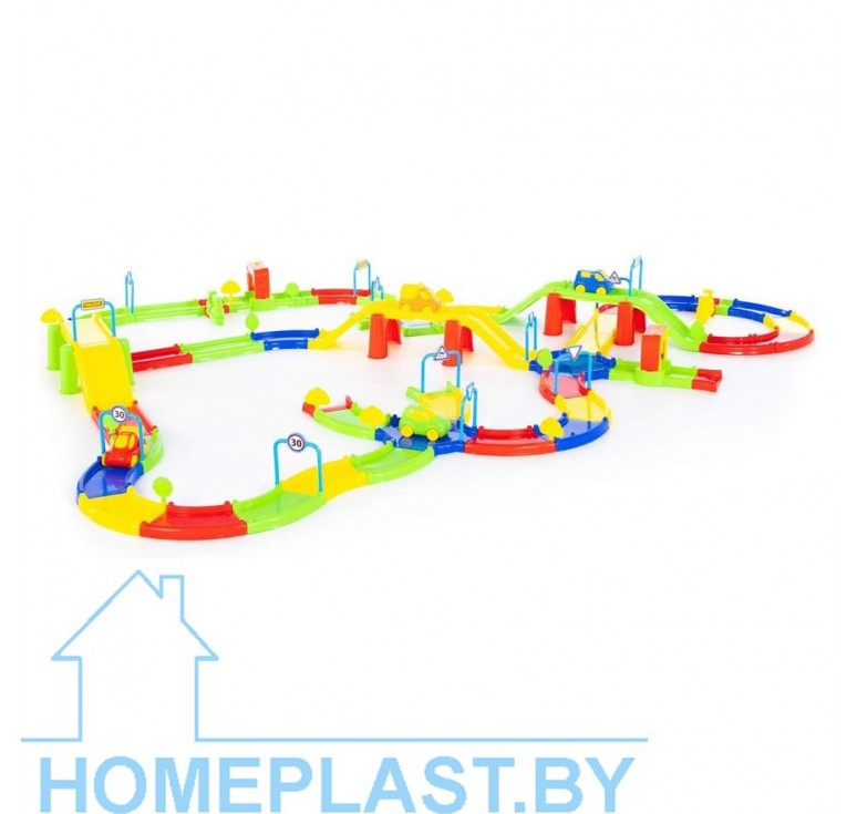 Игровой комплекс представлен в виде яркого сборного гоночного трека. Все элементы имеют округлую форму деталей и выполнены из качественных материалов, благодаря этому игрушка максимально безопасна. В комплекте с треком идут: 12 дорожных знаков, 12 деревьев, 4 автомобиля, а также наклейки. Гоночный трек собирается из 102 элементов, позволяющих дополнительно создать 2 автомойки и 2 автозаправки. Такой комплекс позволит придумывать различные сценарии игры, развивать фантазию и весело проводить время.