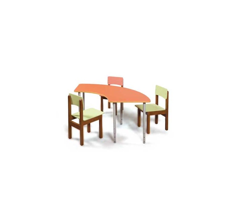 Столешница в форме неполного полукруга (четыре стола, составленных вместе образуют круг) выполнена из ДСП ламинированной толщиной 18 мм яркого цвета, торцы облицованы кромкой ПВХ 2 мм Ножки стола - металлическая труба круглого сечения с прочным полимерным покрытием. Высота стола регулируется на три размера в соответствии с ростовыми группами №1-3 Цветовая гамма в соответсвии с складской программой.