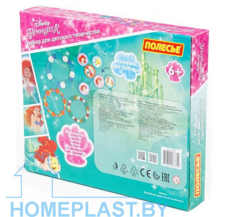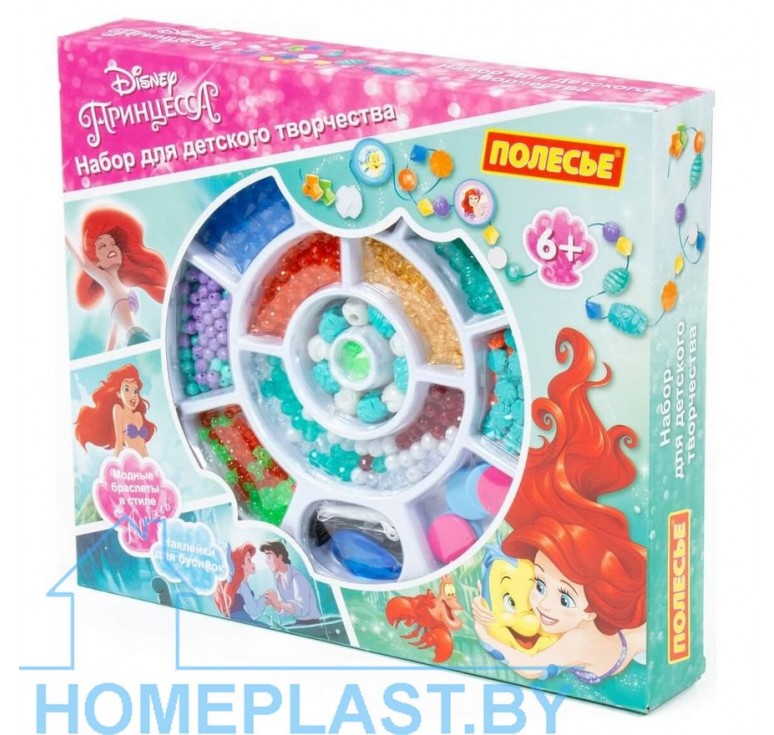 Модные браслеты и бусы для маленькой принцессы девочка может создавать самостоятельно. Достаточно лишь выбрать подходящий набор для детского творчества от компании «Полесье». В креативный набор Disney «Принцесса Ариэль» входят 393 элемента: бусины, наклейки на элементы-медальоны, шнурок, резинка для украшений. Все бусины отличаются по цвету, форме и размеру. Выполнены из качественного пластика. С таким набором ребёнок сможет творить, развивать фантазию и художественный вкус, своими руками создавать бижутерию и играть с ней. Набор упакован в красочную коробку с органайзером и станет ярким подарком для девочки.