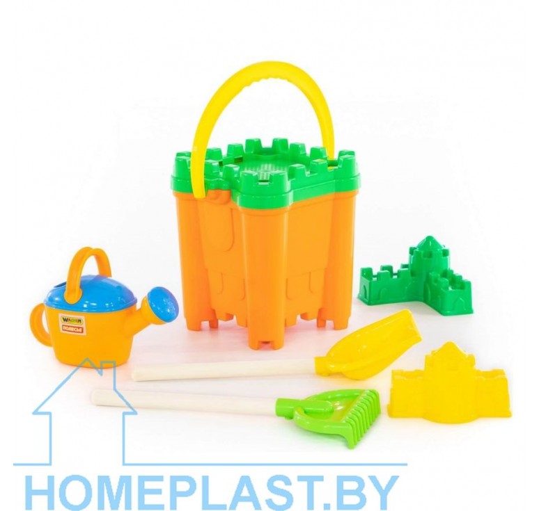 Набор №476: ведро-крепость "Макси", сито-крепость "Макси", лопата №15, грабли №15, формочки (замок стена с одной башней + замок угловой), лейка №8